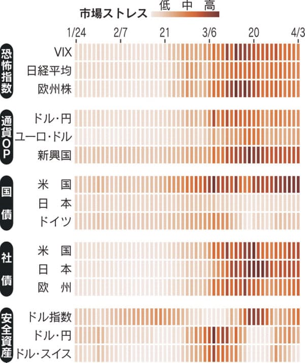 新型コロナウイルスまん延による景気低迷懸念から、世界の金融市場で緊張感(ストレス)が高まってきた。そこで投資家の不安心理や景気動向を反映しやすい15の指標を元に「市場ストレスマップ」を作成した。色の濃さは緊張感の高まりを示す。
