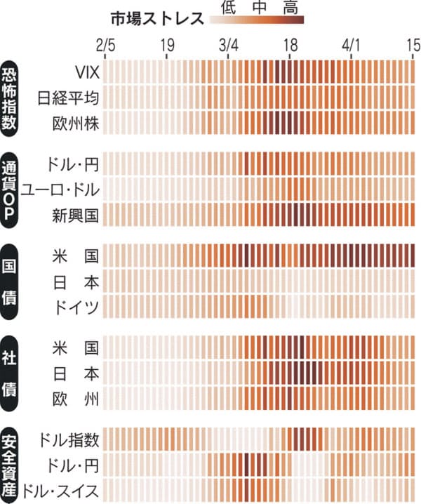 新型コロナウイルスまん延による景気低迷懸念から、世界の金融市場で緊張感(ストレス)が高まっている。そこで投資家の不安心理や景気動向を反映しやすい15の指標を元に「市場ストレスマップ」を作成した。色の濃さは緊張感の高まりを示す。