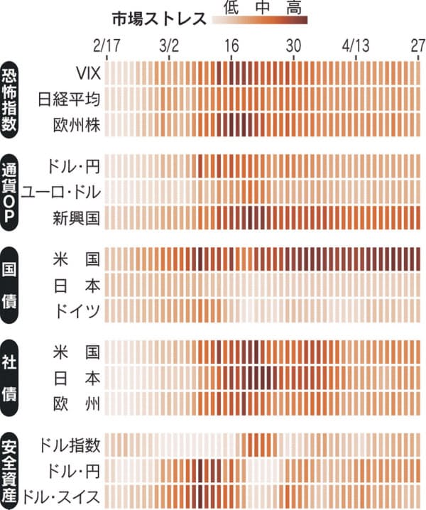 世界株安が進み市場のストレスがピークに達した3月中旬以降、米連邦準備理事会(FRB)による資金供給策などを背景に過度な警戒ムードは後退した。株式市場では経済活動再開への期待もあり、予想変動率が緩やかに低下傾向にある。一方、新興国景気への懸念は根強く、通貨安への不安が高止まりしている。各国の経済対策や金融政策でストレスが緩和されるかが注目される。