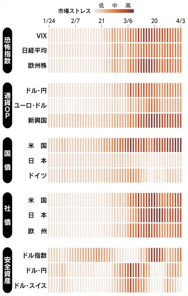新型コロナウイルスは世界の市場を混乱させ、各国の金融政策や財政政策の総動員につながった。日経平均株価が1日で1000円を超えて上下するような値動きは収まったものの、市場関係者は再び急落しかねないと身構えている。世界の金融市場はどこにリスクを嗅ぎ取っているのか。日本経済新聞社は幅広い資産を一覧できる「市場ストレスマップ」を作成した。企業の資金繰りや新興国経済に不安の目が向けられている。