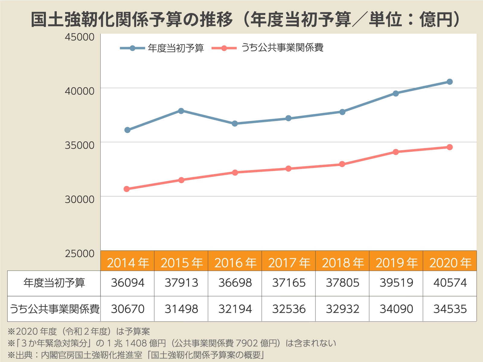 内閣官房国土強靱化推進室の「国土強靱化関係予算案の概要」によると、2014年度は3兆6,094億円だった国土強靱化当初予算が、2020年度予算案では4兆574億円となり、初めて4兆円の大台に乗った。その間の伸び率は12.4%で、公共事業関係費に限ると12.6%伸びている。