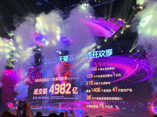 4982億元(約7兆9300億円)──。11月12日に日付が変わると同時に、派手なスモークがたかれ、プレスセンターの巨大スクリーンに数字が大写しにされた。中国アリババ集団が11月11日(独身の日)に仕掛ける年間最大セール「双11(ダブルイレブン)」の、今年の取扱高実績である。